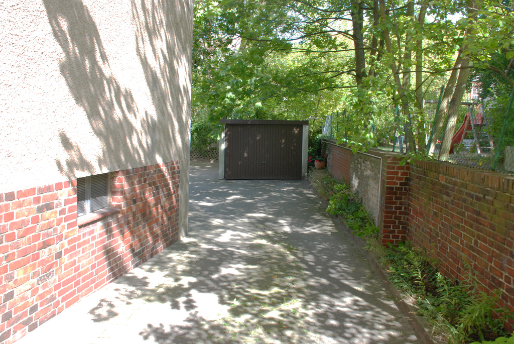Gemauerte Einzelgaragen mit massiven Zwischenwänden und Metalltor.