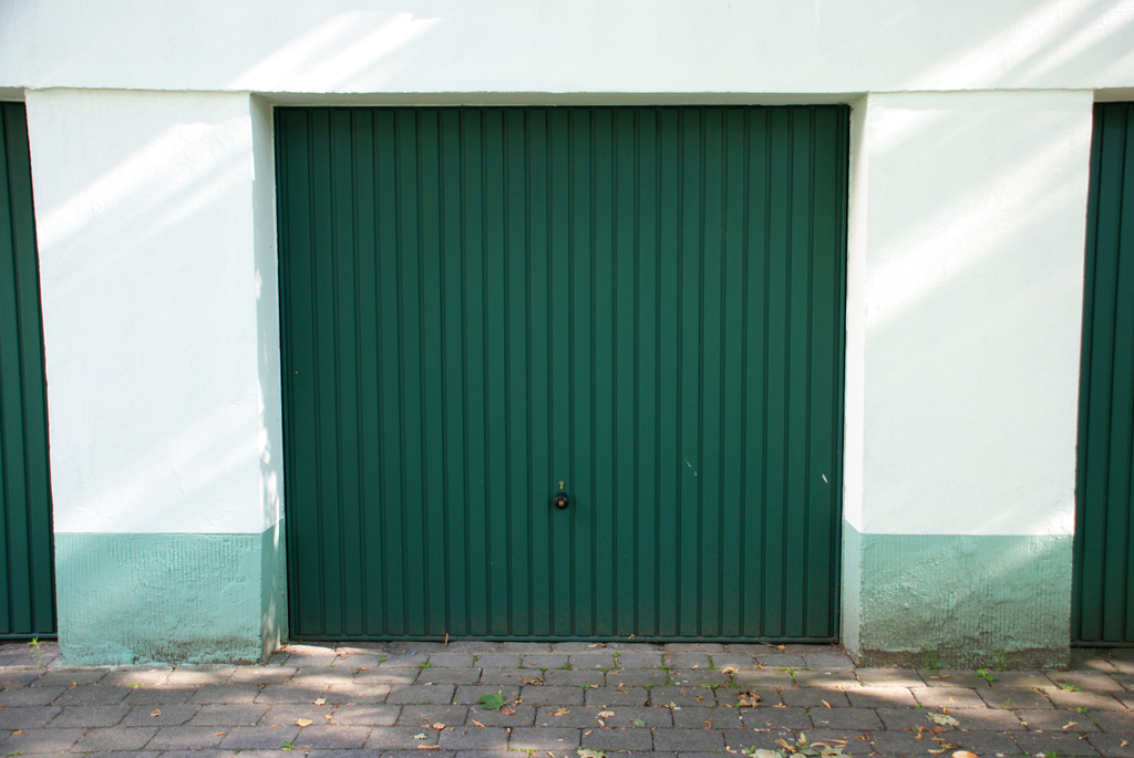 Gemauerte Einzelgaragen mit massiven Zwischenwänden und Metalltor. Die Zufahrt zum Hof ist durch ein Tor gesichert.