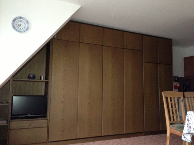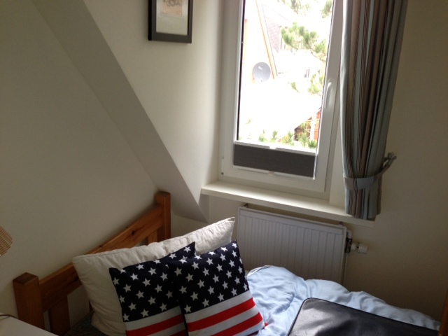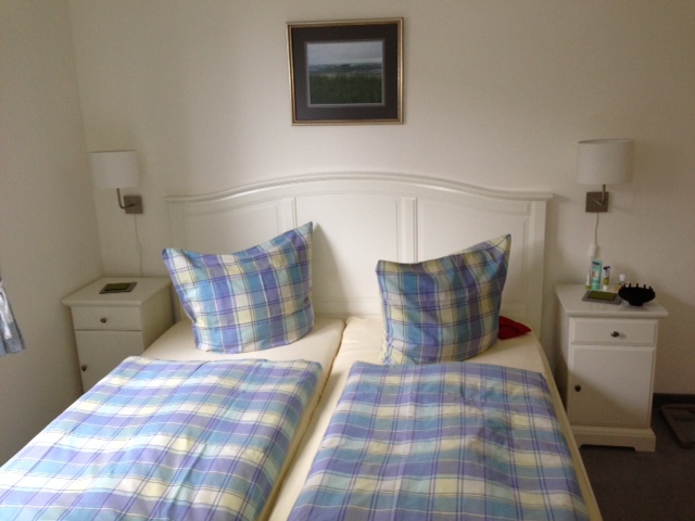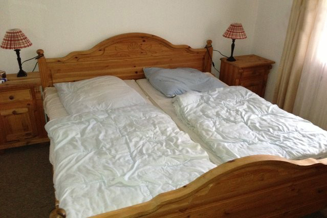 2. Im Obergeschoss eine abgeschlossene Zweieinhalbzimmerwohnung mit etwa 50 qm Wohnfläche und fünf Betten, bestehend aus einem Wohnzimmer mit Doppelbett im Einbauschrank und Wohnküche, einem Schlafzimmer mit zwei Betten, Dusche mit WC und einem weiteren kleinen Schlafzimmer mit einem Bett (Zugang durch das größere Schlafzimmer) und einem großem Kleiderschrank im kleinen Schlafzimmer.