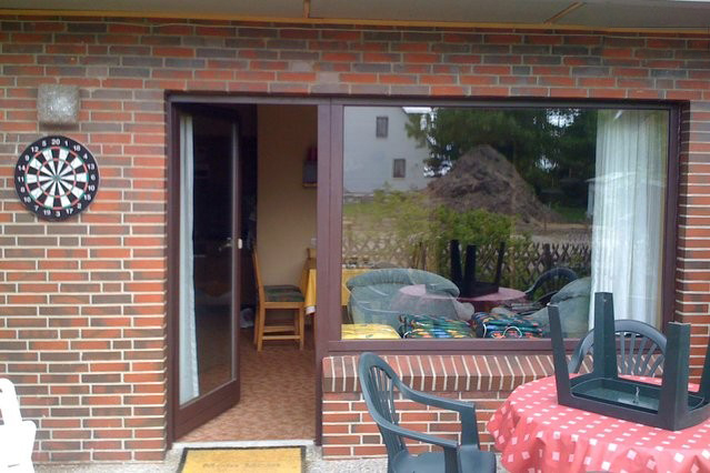 1. Im Erdgeschoss eine abgeschlossene Zweizimmerwohnung mit etwa 50 qm Wohnfläche und vier Betten, bestehend aus einem Wohnzimmer mit Doppelbett im Einbauschrank und Wohnküche, einem Schlafzimmer mit zwei Betten, Dusche mit WC, Terrasse und kleinem Garten (Südseite).