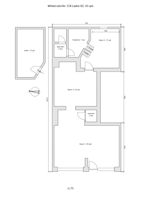 Zwei große und zusammenhängende Räume im vorderen Teil sowie ein weiterer Raum und eine über eine Treppe zu erreichende Teeküche sowie ein kleines Bad mit WC im hinteren Teil. Die beiden vorderen